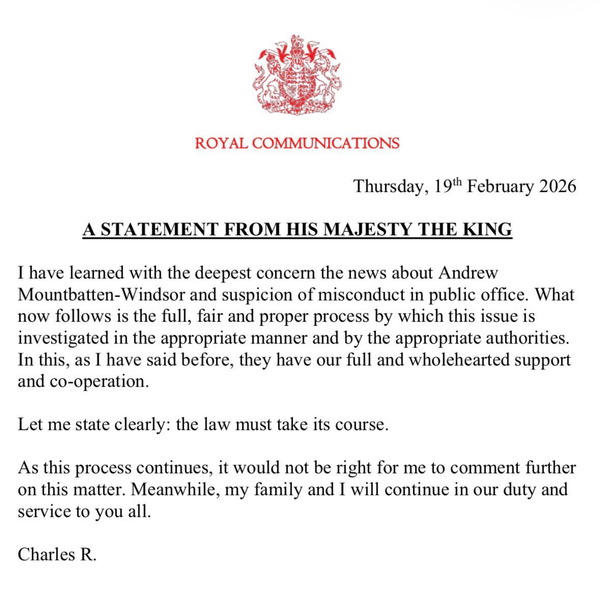 This afternoon, King Charles III issued the following statement: