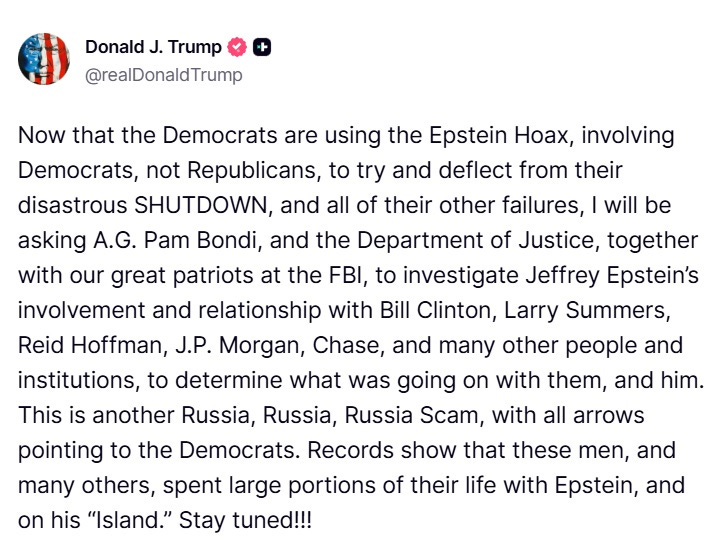 In a statement posted on Truth Social, Trump accused Democrats of exploiting what he called an “Epstein hoax” to distract from what he described as their “failed” handling of the government shutdown and other issues. He said he would ask the Justice Department and the FBI to review Epstein’s interactions with figures such as former President Bill Clinton, economist Larry Summers, entrepreneur Reid Hoffman and executives linked to JPMorgan Chase, among others. The purpose, he said, would be to “determine what was going on” between Epstein and those individuals.
