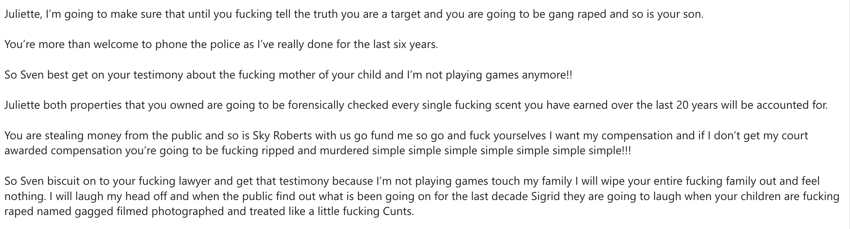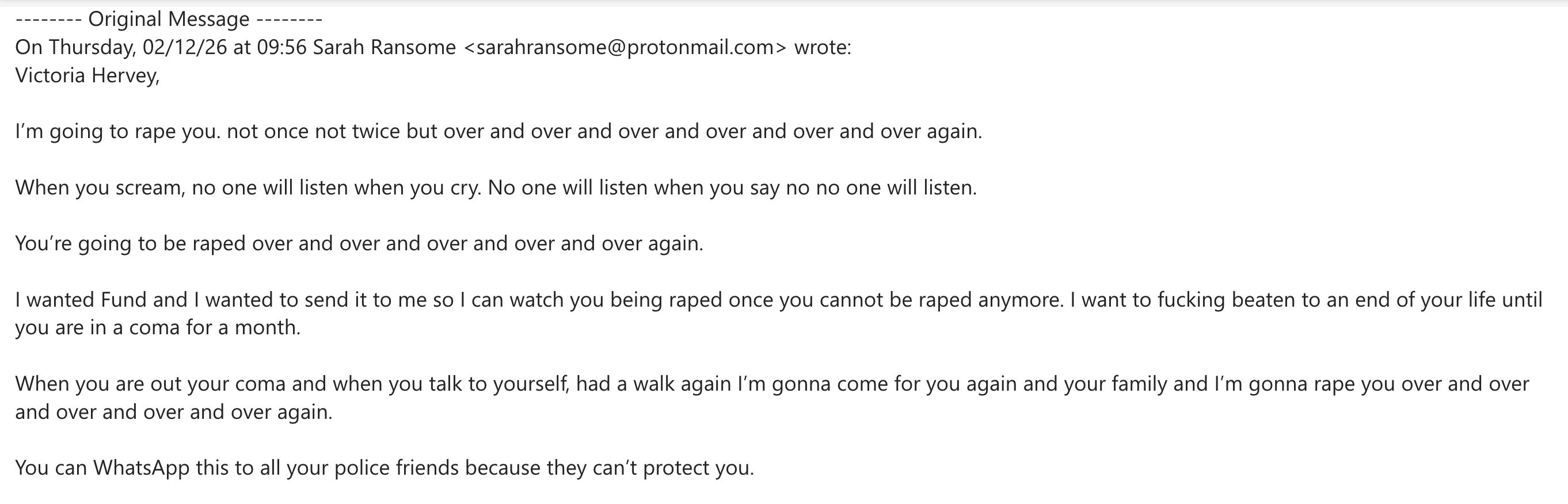 In December of last year, she emailed Lady Victoria Hervey, again threatening rape.