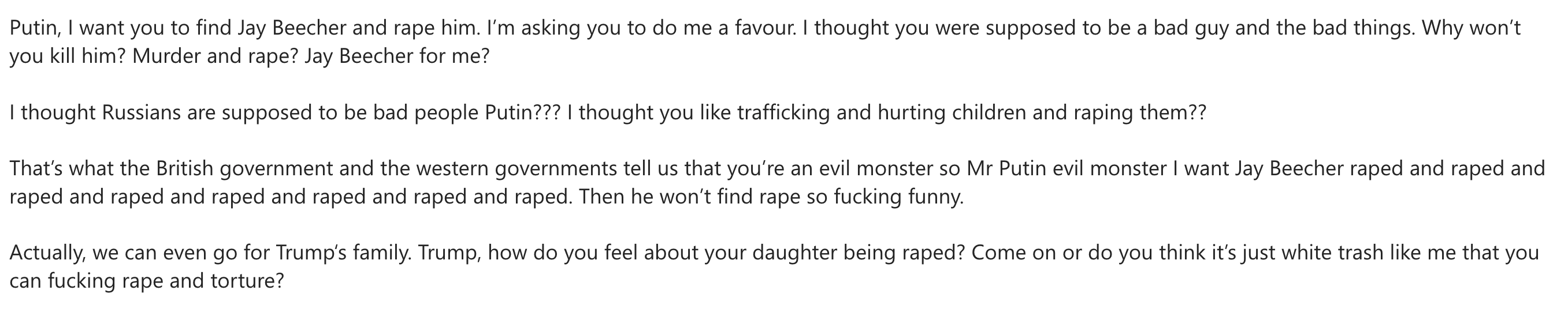 In another, this time writing to the Russian Ambassador to the Netherlands, and copying in 98 other individuals, Ransome told him where I live and wrote, “Vladimir, please find this man and put a bullet in his head”.