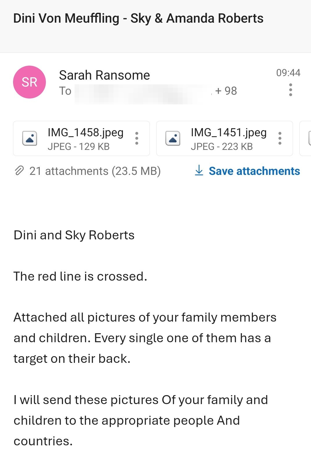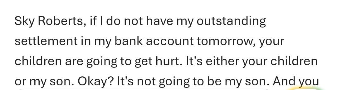 “If I do not have my outstanding settlement in my bank account tomorrow, your children are going to get hurt,” her email concluded.
