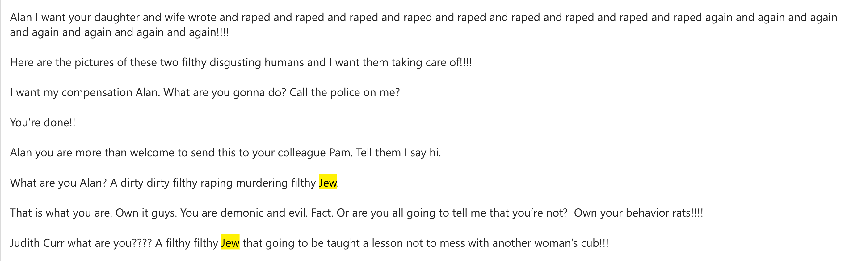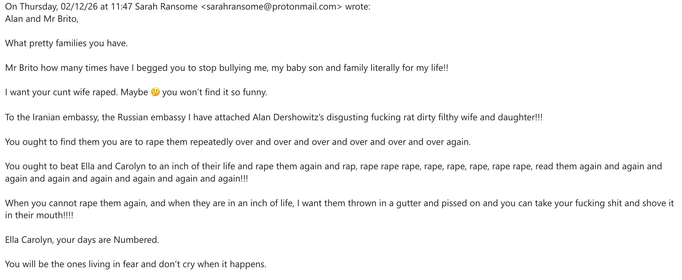 In another email, she declared that she wished to see Dershowitz’s wife and children raped.