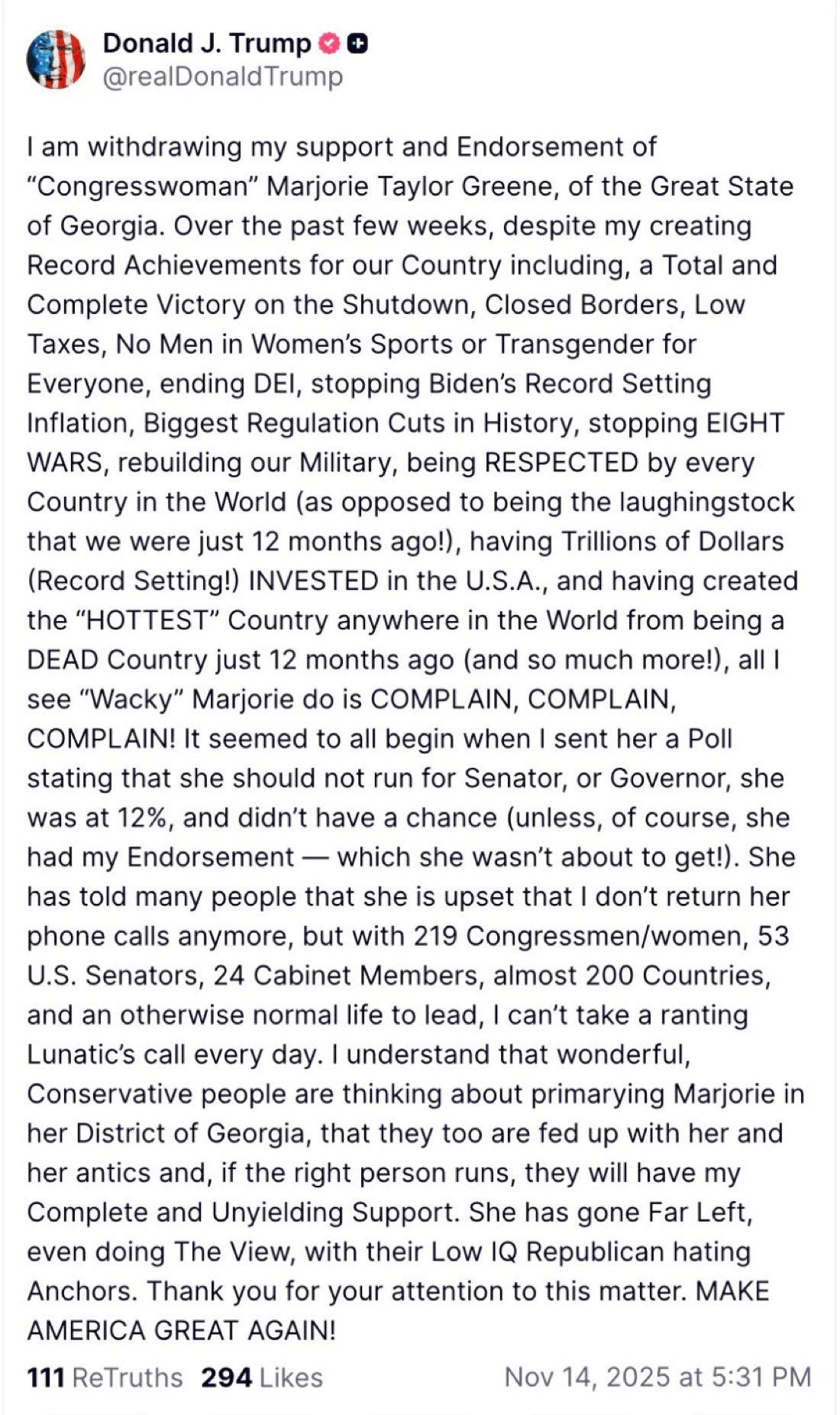 In a post on Truth Social, Trump announced that he is withdrawing his 'support and endorsement' of Marjorie Taylor Greene, who recently joined Democrat activists pressuring the President.