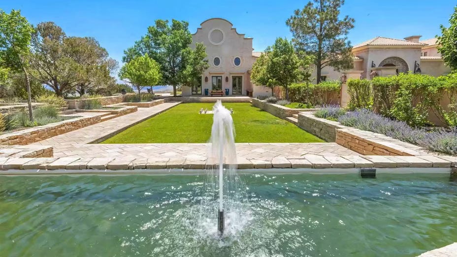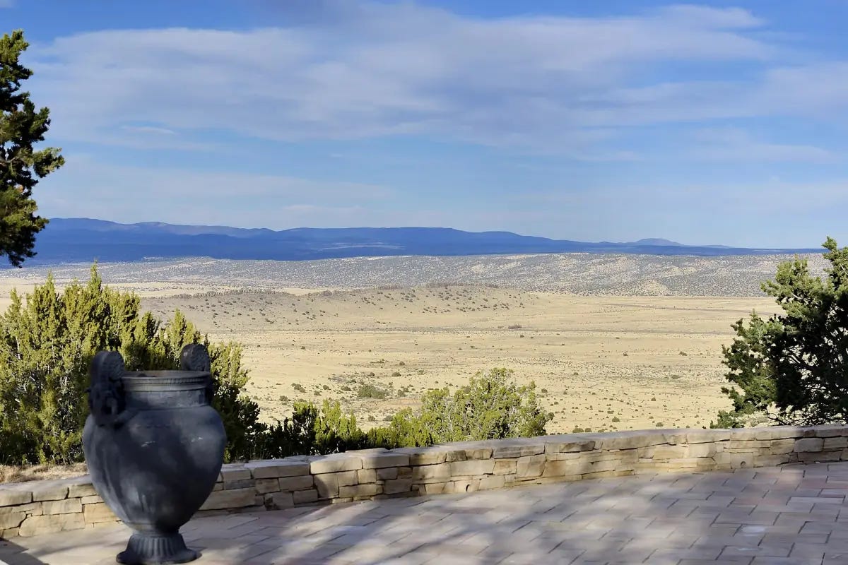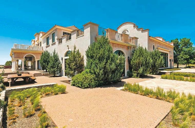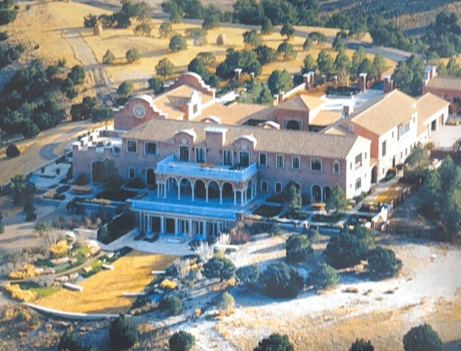 The ranch spanned thousands of acres – reports vary between roughly 7,500 and 10,000 – making it a domain unto itself. At its heart stood a vast, hacienda-style mansion, often cited as being between 26,000 and 30,000 square feet. Built in the stucco-and-adobe tradition of the region, its cream-colored walls and terracotta roofs rose in sharp relief against the open blue sky. The main house, not completed until later 1999/early 2000, formed a wide U-shape around inner courtyards, with shaded porticoes, fountains, and terraces that looked out toward distant mountain ridges. From above, the estate seemed less like a single dwelling than a small compound – a deliberate echo of the Spanish colonial architecture that still defines much of northern New Mexico.