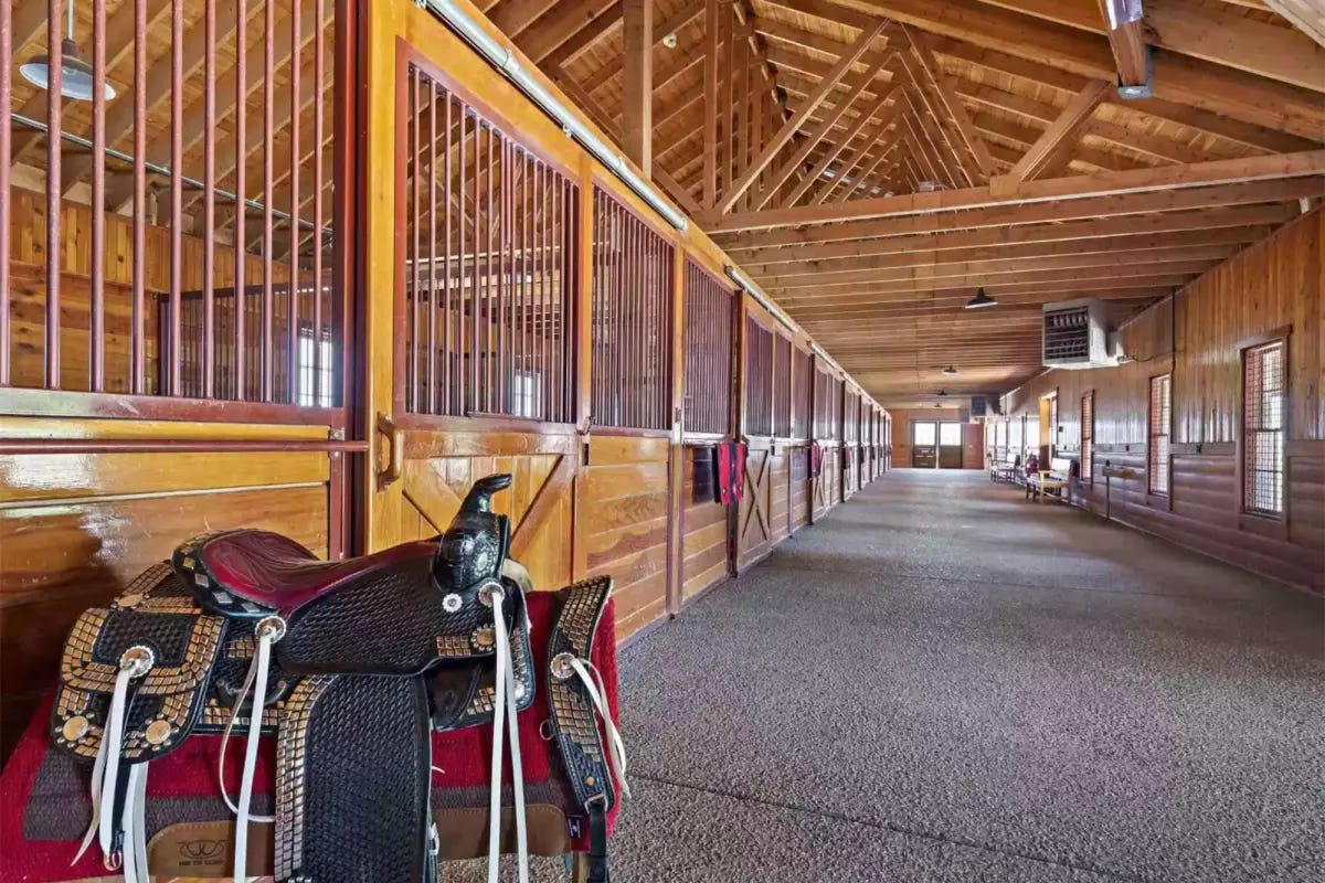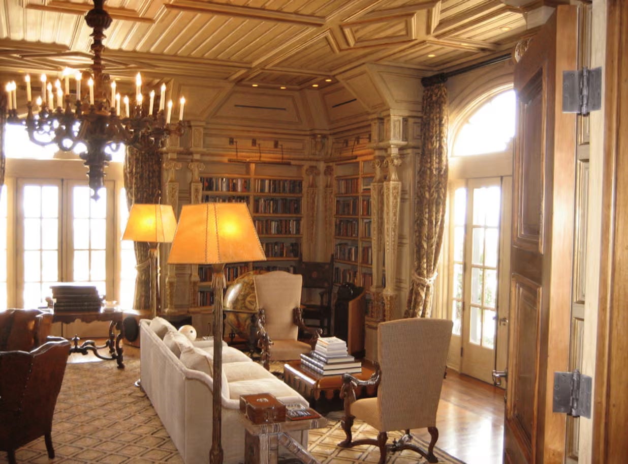Inside, the main residence reflected a blend of Southwestern motifs and conspicuous luxury. Reports and estate photographs describe wide, echoing halls; cavernous living spaces; and suites large enough to feel like apartments in their own right. Stone fireplaces, heavy wood beams, and arched windows gave the rooms a stylised regional character, but the scale – designed for entertaining or isolation – remained distinctly out of proportion with the understated local ranch culture. Courtyards opened into tiled patios, and the large pool glittered behind the house like a mirage in the desert heat.