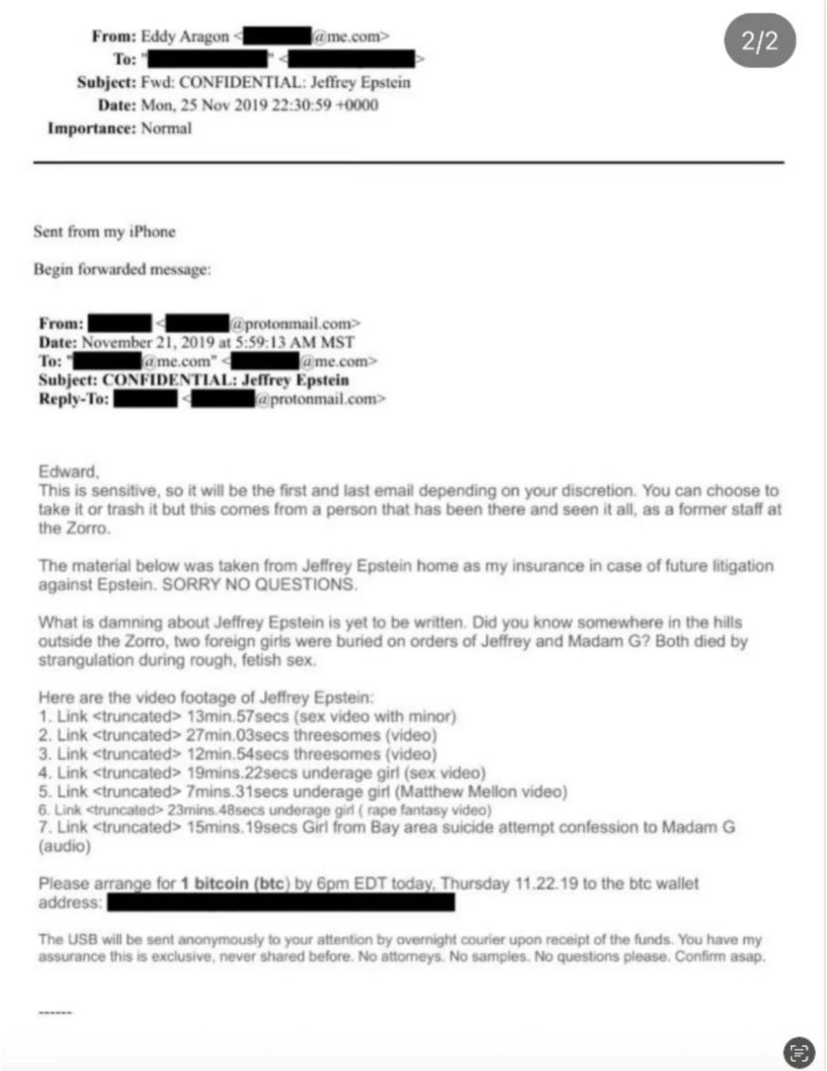 The sender, claiming, without proof, to be a former Zorro Ranch employee, requested payment of one bitcoin (worth thousands of dollars) in return for videos that the email said had been taken from Epstein’s house and showed the financier having sex with minors.